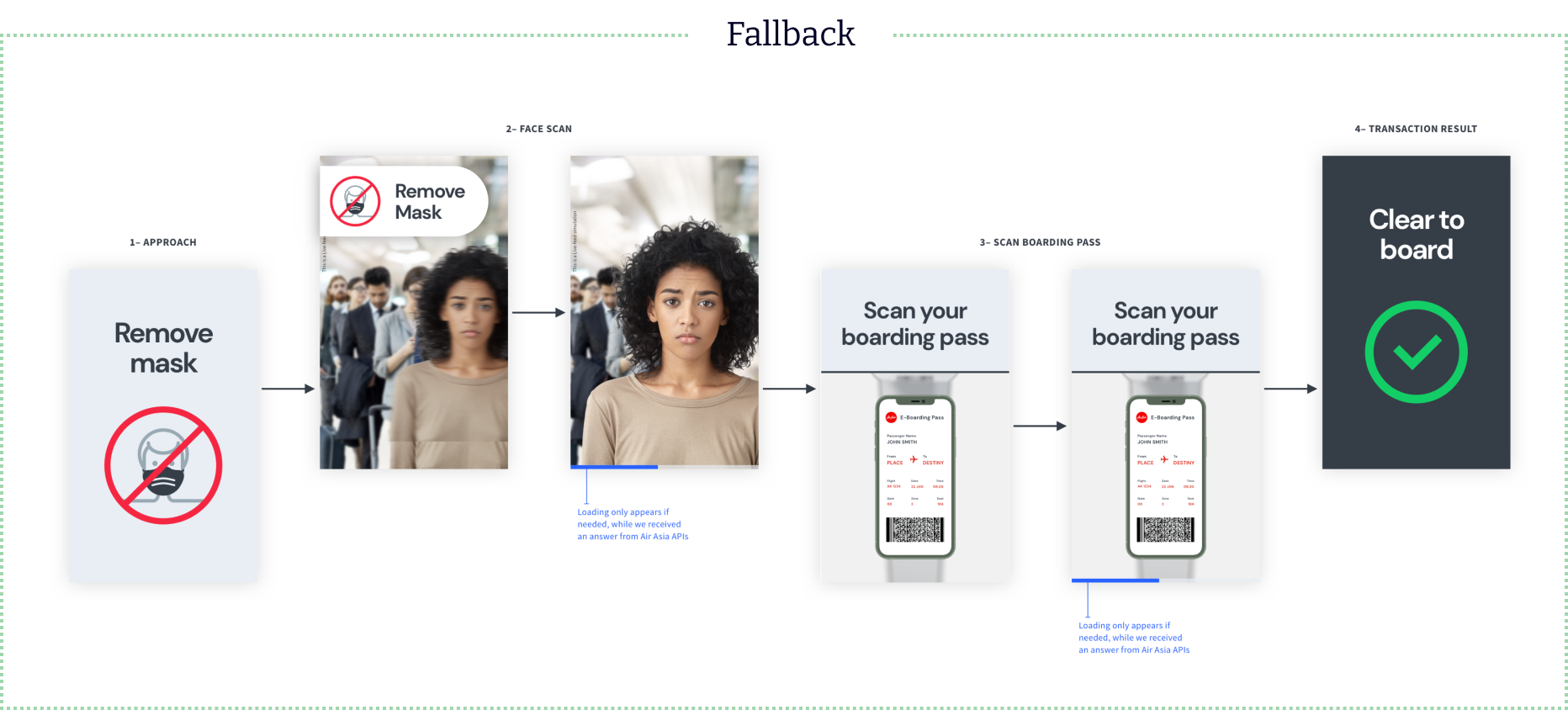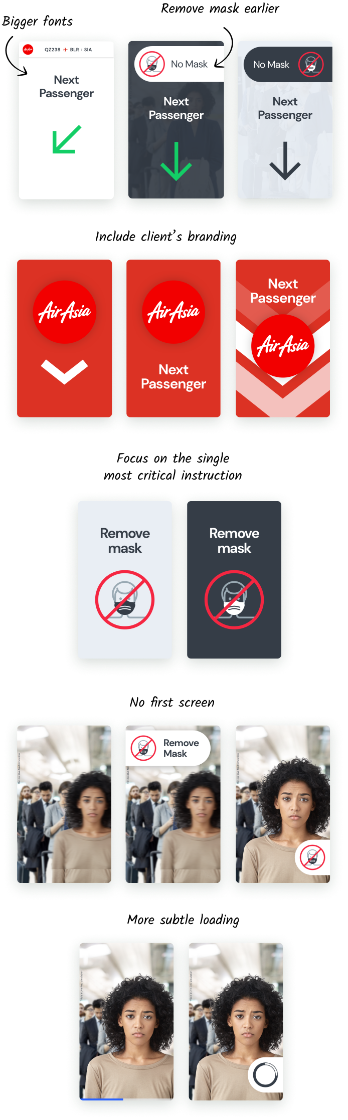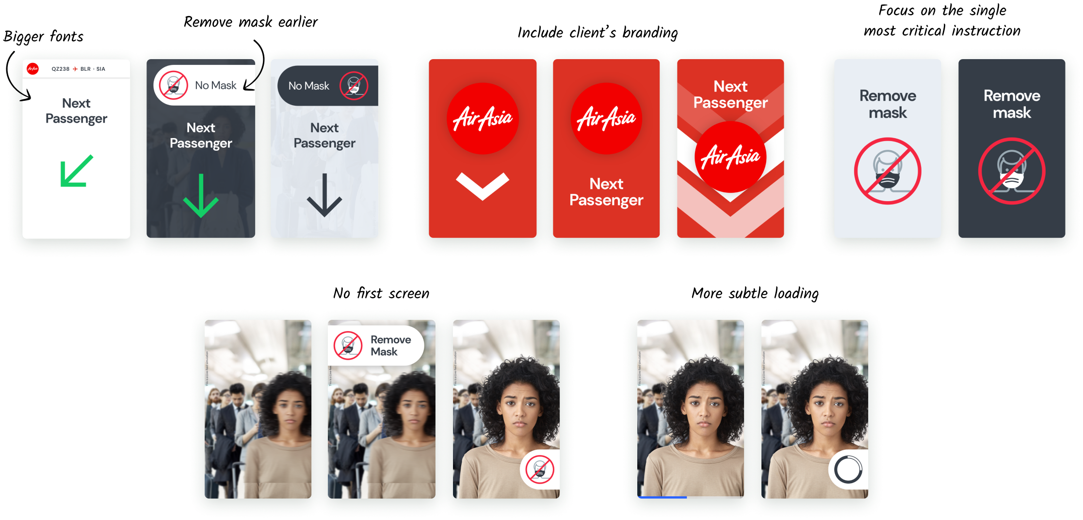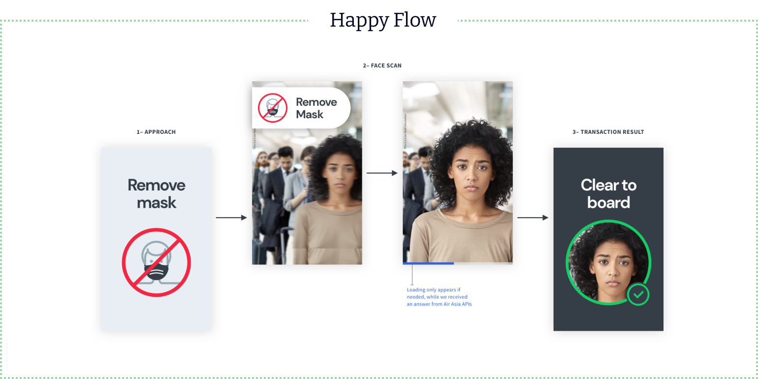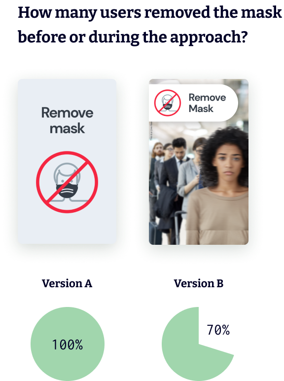 I performed an A/B test using my phone to validate the proposals. Although I could not compare the timings against the previous test, I could ensure that the passengers were removing the mask before approaching the camera and that would definitely increase the speed.